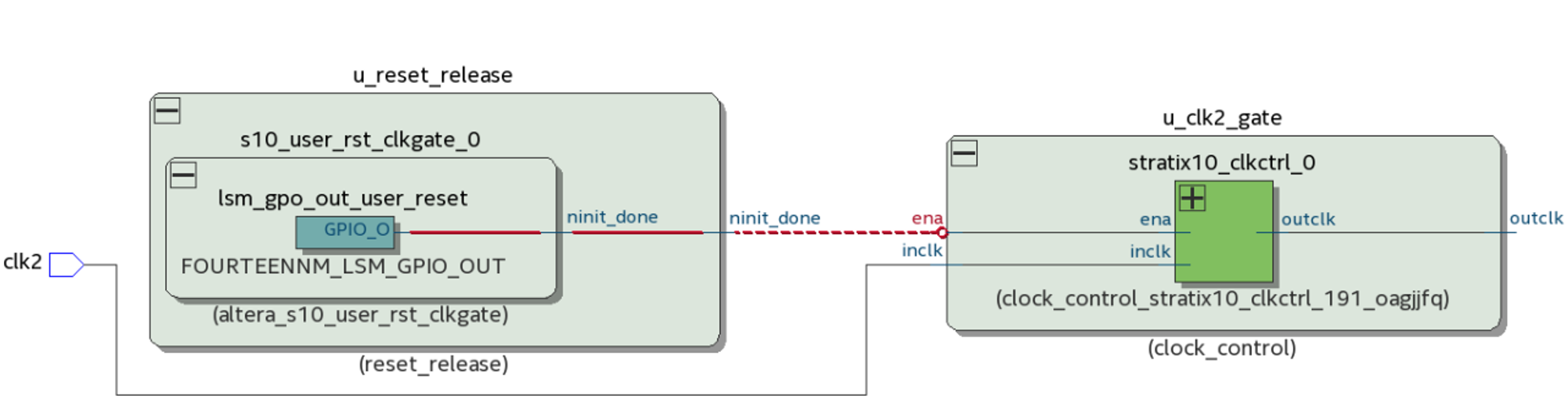 - Clock Control Intel® FPGA IP—uses the inverted nINIT_DONE signal as a clock enable signal.