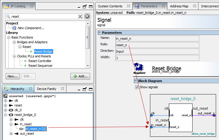 You can view the polarity status of a reset signal by selecting the signal in the Hierarchy tab, and then view its expanded definition in the open Parameters and Block Symbol tabs. When you generate your component, Platform Designer interconnect automatically inverts polarities as needed.