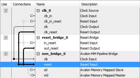 When you generate your component, Platform Designer inserts adapters to synchronize or invert resets if there are mismatches in polarity or synchronization between the source and destination. You can view inserted adapters on the Memory-Mapped Interconnect tab with the System > Show System with Platform Designer Interconnect command.