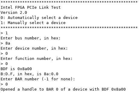 - In manual mode, the test queries you for the bus, device, and function number and BAR.
