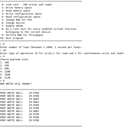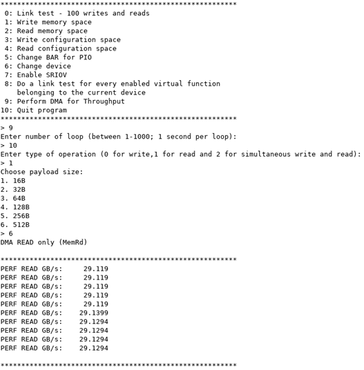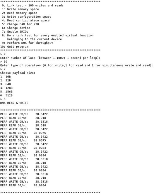 - Enter number of DMA iterations to be carried out and then press Enter key to select the type of DMA operation, “0” for write operation (device to host), “1” for read operation (host to device) and “2” for simultaneous write and read operations.