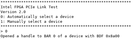 You can run the Intel FPGA IP PCIe link test application in manual or automatic mode. Select from:- In automatic mode, the application automatically selects the device. The test selects the Intel PCIe device with the lowest BDF by matching the Vendor ID. The test also selects the lowest available BAR.