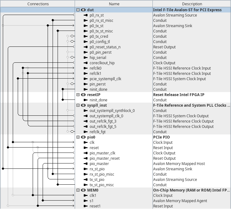 Figure 4. Platform Designer System Contents for F-Tile Avalon® -ST IP for PCI Express PIO Design Example [Gen4 x16 variant]The Platform Designer generates this design for up to Gen4 x16 variants.