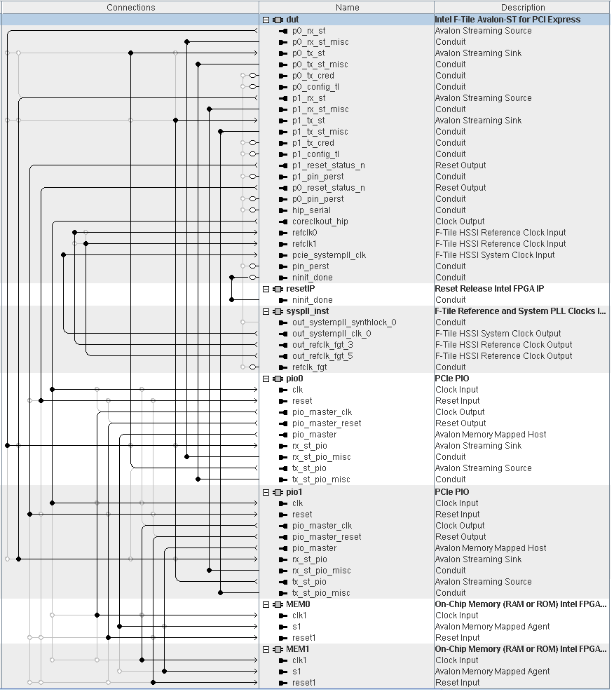 Figure 5. Platform Designer System Contents for F-Tile Avalon® -ST IP for PCI Express PIO Design Example [Gen4 x8x8 variant]