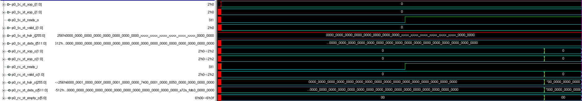 Trace the transition of signal p0_rx_st_sop_o[0] (for example h'0 to h'1) for the first memory write. It is followed by a memory read at the Avalon® -ST RX interface of the F-tile Hard IP for PCIe. The Completion TLP appears shortly after the memory read request at the Avalon® -ST TX interface. The memory write and read transactions and the Completion TLP are shown in the following waveforms.