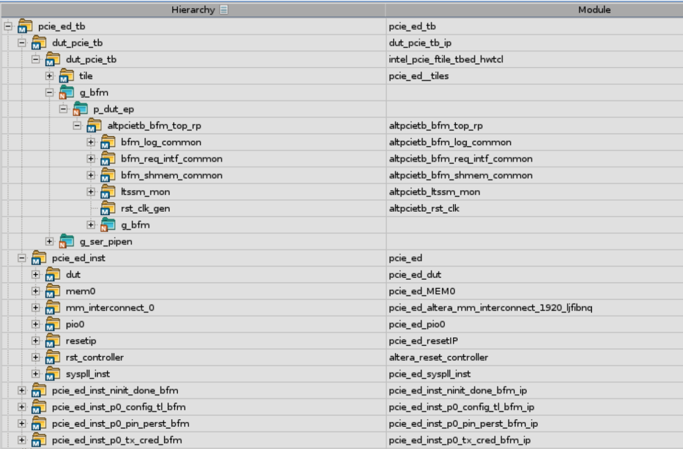 The figure below shows the PIO design example simulation design hierarchy. The tests for the PIO design example are defined with the apps_type_hwtcl parameter set to 3. The tests run under this parameter value are defined in ebfm_cfg_rp_ep_rootport, find_mem_bar and downstream_loop.