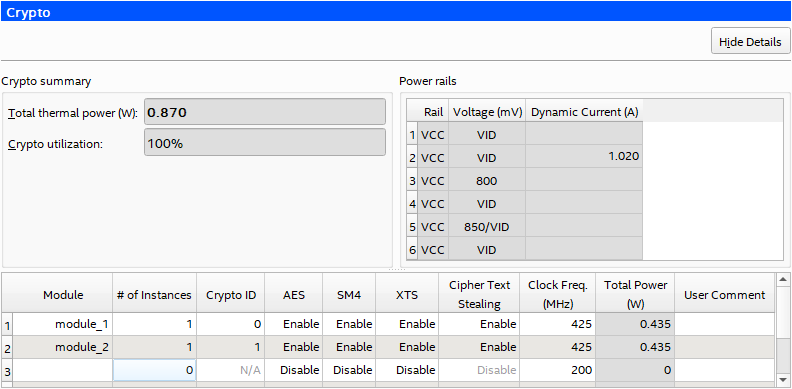 Certain Intel® Agilex™ devices have crypto blocks, consisting of hardened logic that can perform encryption and decryption functions. The Crypto page of the Intel® FPGA Power and Thermal Calculator ( Intel® FPGA PTC) allows you to configure crypto blocks for Intel® Agilex™ devices equipped with those blocks, and to obtain power estimates for crypto use.