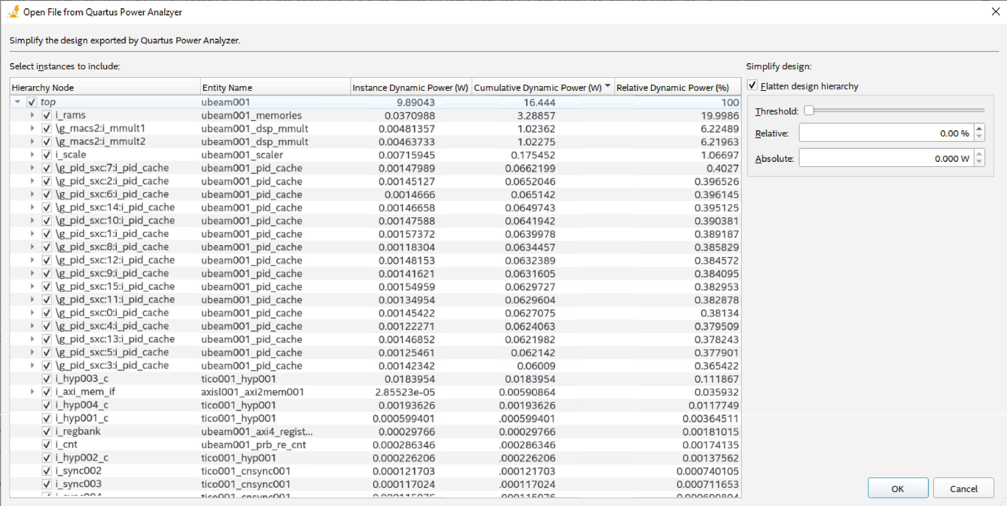 | Absolute | Allows you to specify a flattening threshold in terms of absolute dynamic power, measured in watts. The valid range of values is from 0 W to the full dynamic power estimate included in the Intel® Quartus® Prime Power Analyzer report. | |
