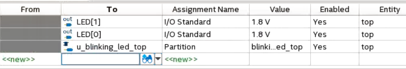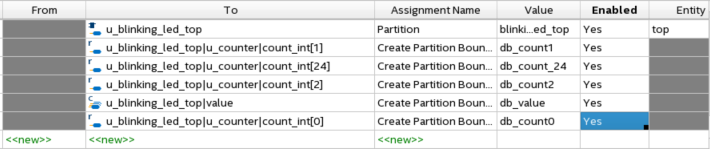 For example, for node u_blinking_led_top|u_blinking_led|value, double-click Assignment Name and select Create Partition Boundary Ports. Double-click value to provide a port name db_value. Leave rest of the columns as default.Figure 12. Assignment Editor