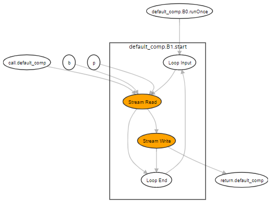 Conduit interfaces are implemented for any function parameter whose arguments are passed by value. The Function View of the System Viewer report connects the conduit interface to the corresponding stream read (RD) node. The read is synchronized with the start/busy signals on the component invocation interface.
