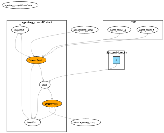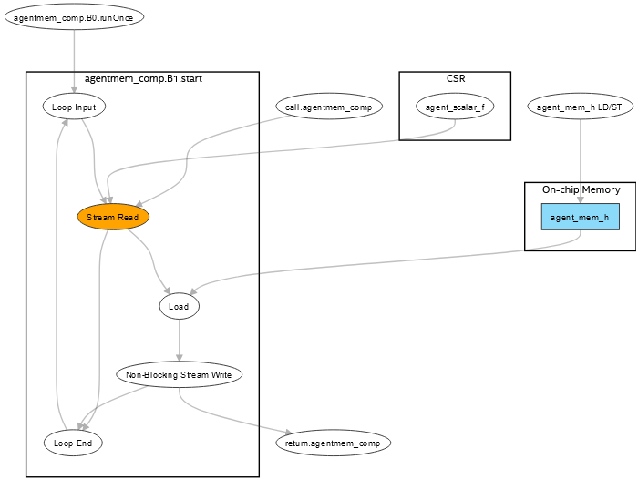 When you declare a pointer argument as a agent memory, the Function View of the System Viewer shows the agent memory interface with a <agent memory name> LD/ST node that is connected to the Local Memory node in the component.