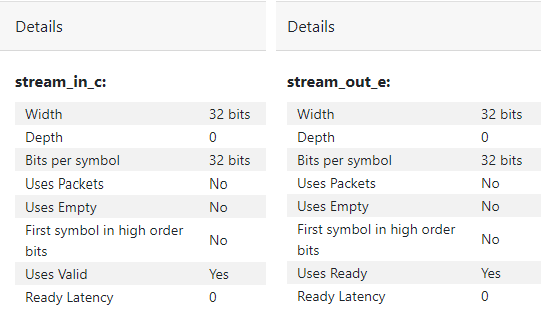 (stream_in) Indicates whether a valid signal is present on the stream interface. When Yes, the upstream source must provide valid data on every cycle that ready is asserted.