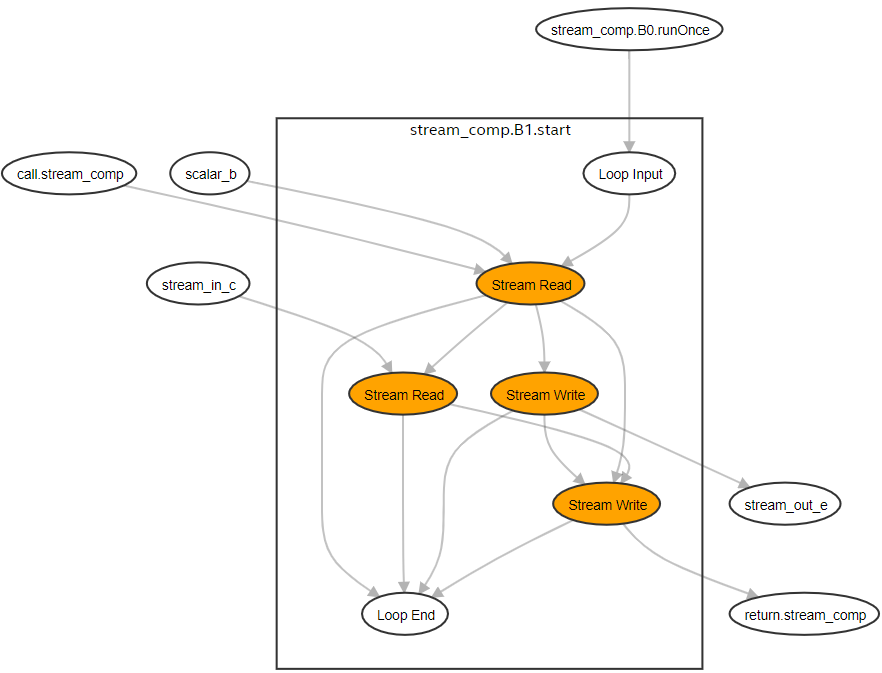 A streaming interface is shown in the Function View of the System Viewer by a <stream name> node connected to the corresponding RD node (for stream_in<>) or WR node (for stream_out<>).