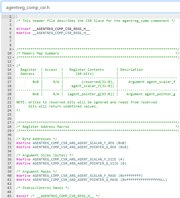 The resulting memory map is described in the automatically generated header file <component_name>_csr.h. This header file is available in the menu in the source code pane. Clicking on the CSR container node in the Function View of the System Viewer also opens up the header file: