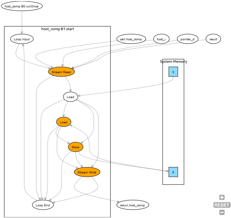 Each ihc::mm_host<> argument of a component results in an input conduit for the base address, which is connected to a Read node in the system viewer. In addition to this input conduit, a unique Avalon MM Host interface is created for each address space. This interface is connected to one or more Load or Store nodes in the system viewer.