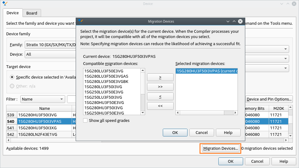 If you want the Quartus® Prime software to display all compatible migration devices in the Compatible migration devices list regardless of a migration device's speed grade, turn on the Show All Speed Grades checkbox. If you want the Quartus® Prime software to display in the Compatible migration devices list only the compatible migration devices that have the same speed grade as the target device, turn off Show all speed grades.