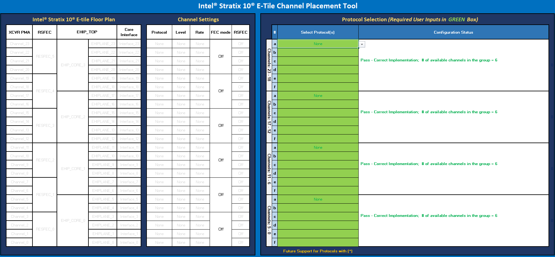 E-tile supports datacenters, 5G networks, Smart Grid and other market segments. Ethernet, CPRI and OTN are the backbone of these emerging and traditional technologies. The E-Tile Channel Placement Tool, in conjunction with the Device Family Pin Connection Guidelines, allows you to swiftly plan protocol placements in the product prior to reading comprehensive documentation and implementing designs in Intel® Quartus® Prime.