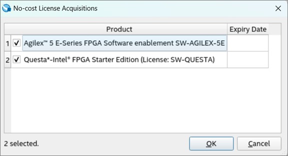 To obtain licenses for Agilex™ 5 E-Series FPGA and Questa*-Intel® FPGA Starter Edition from this dialog: