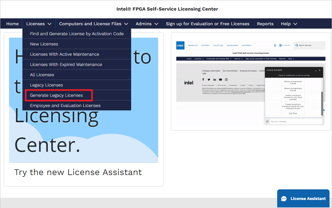 You must log into the Altera® FPGA Self-Service Licensing Center to create and manage your licenses. From the Altera® FPGA Self-Service Licensing Center Home page, use the new License Assistant. You can find this assistant on the bottom right corner of every page. For detailed instructions about how to obtain and manage licenses in the Altera® FPGA Self-Service Licensing Center, refer to Using the Altera FPGA Self-Service Licensing Center.