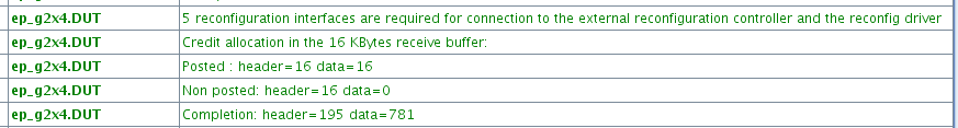 Initially, each lane and TX PLL require a separate reconfiguration interface. The parameter editor reports this number in the message pane. You must take note of this number so that you can enter it as a parameter value in the Transceiver Reconfiguration Controller parameter editor. The following figure illustrates the messages reported for a Gen2 ×4 variant. The variant requires five interfaces: one for each lane and one for the TX PLL.
