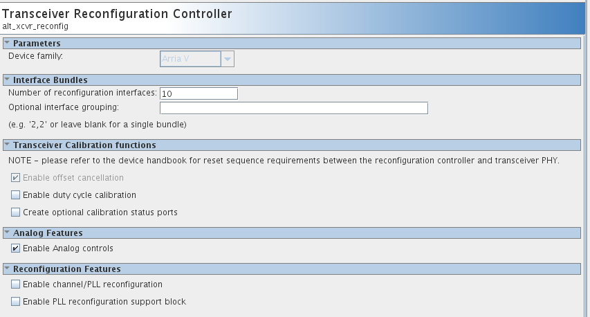 The Transceiver Reconfiguration Controller IP Core is available for V-series devices and can be found in the Interface Protocols/Transceiver PHY category in the IP Catalog. When you instantiate the Transceiver Reconfiguration Controller the Enable offset cancellation block and Enable PLL calibration options are enabled by default.