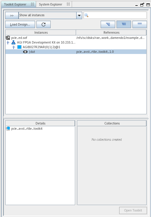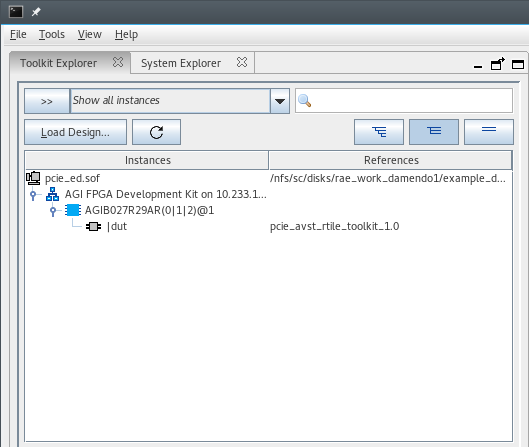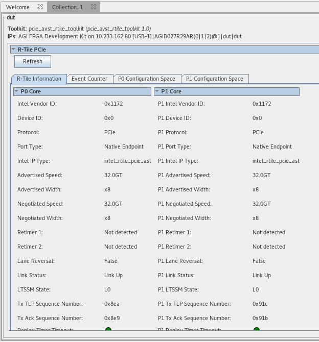 - The System Console Toolkit Explorer window will list all the DUTs in the design that have the R-tile Debug Toolkit enabled.