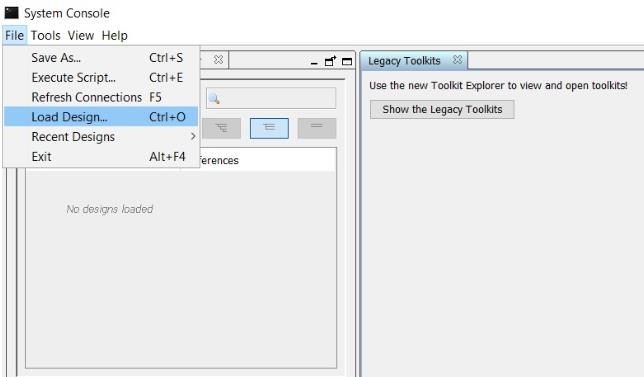 - On the System Console File menu, select Load Design and browse to the .sof file.
