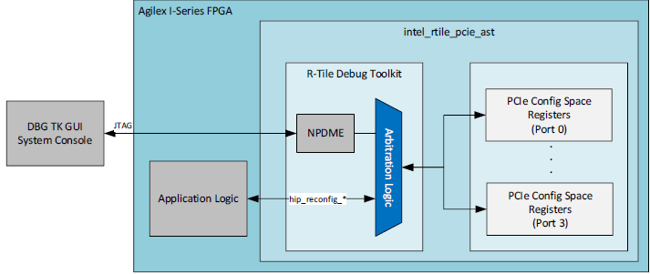 When you enable the R-Tile Debug Toolkit in the IP Parameter Editor, the Hard IP Reconfiguration Interface will be enabled. A multiplexer is implemented to allow a dynamic switching between the Application logic and the Debug Toolkit. The Application logic has the default access. Upon launching the Debug Toolkit in the System Console tool, the arbitration selection happens automatically. While the DTK is open in the System Console, Application logic will not be able to drive signals on the Hard IP Reconfiguration Interface. Once the Debug Toolkit window in the System Console is closed, the Application logic can once again drive the Hard IP Reconfiguration Interface.