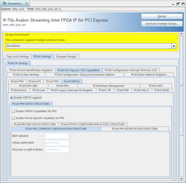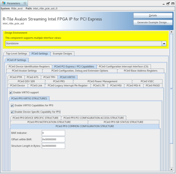 Enable PFs 0-7 VFs VirtIO Device-Specific Capability | Enable VirtIO Device-Specific Configuration Structure Capability of VFs associated with PFs 0-7. This parameter is located under the PFn VFs VirtIO Structures tab. | True / False | False |