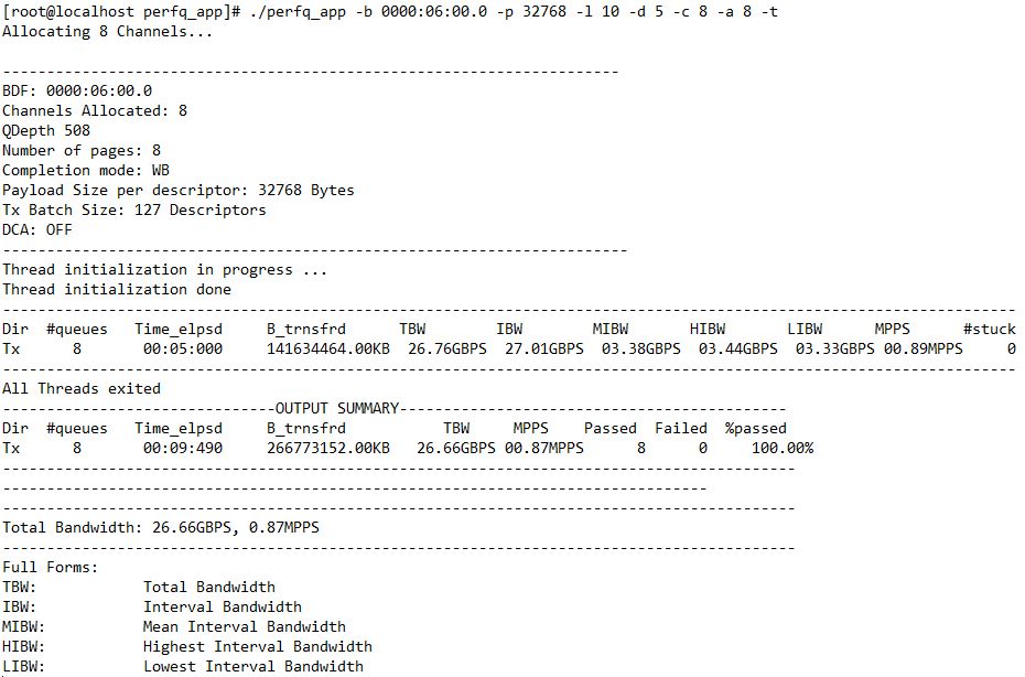 [root@localhost perfq_app]# ./perfq_app -b 0000:2d:00.0 -p 32768 -l 10 -d 5 -c 8 -a 8 -r Allocating 8 Channels... ---------------------------------------------------------------------- BDF: 0000:2d:00.0 Channels Allocated: 8 QDepth 508 Number of pages: 8 Completion mode: WB Payload Size per descriptor: 32768 Bytes SOF on descriptor: 1 EOF on descriptor: 1 File Size: 32768 Bytes PKG Gen Files: 64 Rx Batch Size: 127 Descriptors DCA: OFF ----------------------------------------------------------------------- Thread initialization in progress ... Thread initialization done ------------------------------------------------------------------------------------------------------------------- Dir #queues Time_elpsd B_trnsfrd TBW IBW MIBW HIBW LIBW MPPS #stuck Rx 8 00:05:000 127333248.00KB 24.28GBPS 24.28GBPS 03.04GBPS 03.04GBPS 03.04GBPS 00.80MPPS 0 ------------------------------------------------------------------------------------------------------------------- All Threads exited ------------------------------------------------------------------------------------------------------------------- Dir #queues Time_elpsd B_trnsfrd TBW IBW MIBW HIBW LIBW MPPS #stuck Rx 8 00:10:000 251390912.00KB 23.97GBPS 23.66GBPS 02.96GBPS 02.96GBPS 02.96GBPS 00.78MPPS 0 ------------------------------------------------------------------------------------------------------------------- TIME OUT while waiting for completions Leaving... -------------------------------OUTPUT SUMMARY-------------------------------------------- Dir #queues Time_elpsd B_trnsfrd TBW MPPS Passed Failed %passed Rx 8 00:10:871 251390912.00KB 24.29GBPS 00.80MPPS 8 0 100.00% ------------------------------------------------------------------------------------------ -------------------------------------------------------------------------------- ------------------------------------------------------------------------------------------ Total Bandwidth: 24.29GBPS, 0.80MPPS ------------------------------------------------------------------------------------------ Full Forms: TBW: Total Bandwidth IBW: Interval Bandwidth MIBW: Mean Interval Bandwidth HIBW: Highest Interval Bandwidth LIBW: Lowest Interval Bandwidth