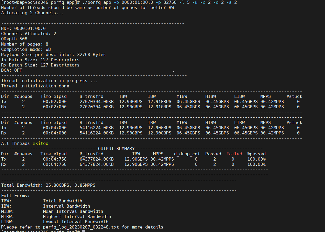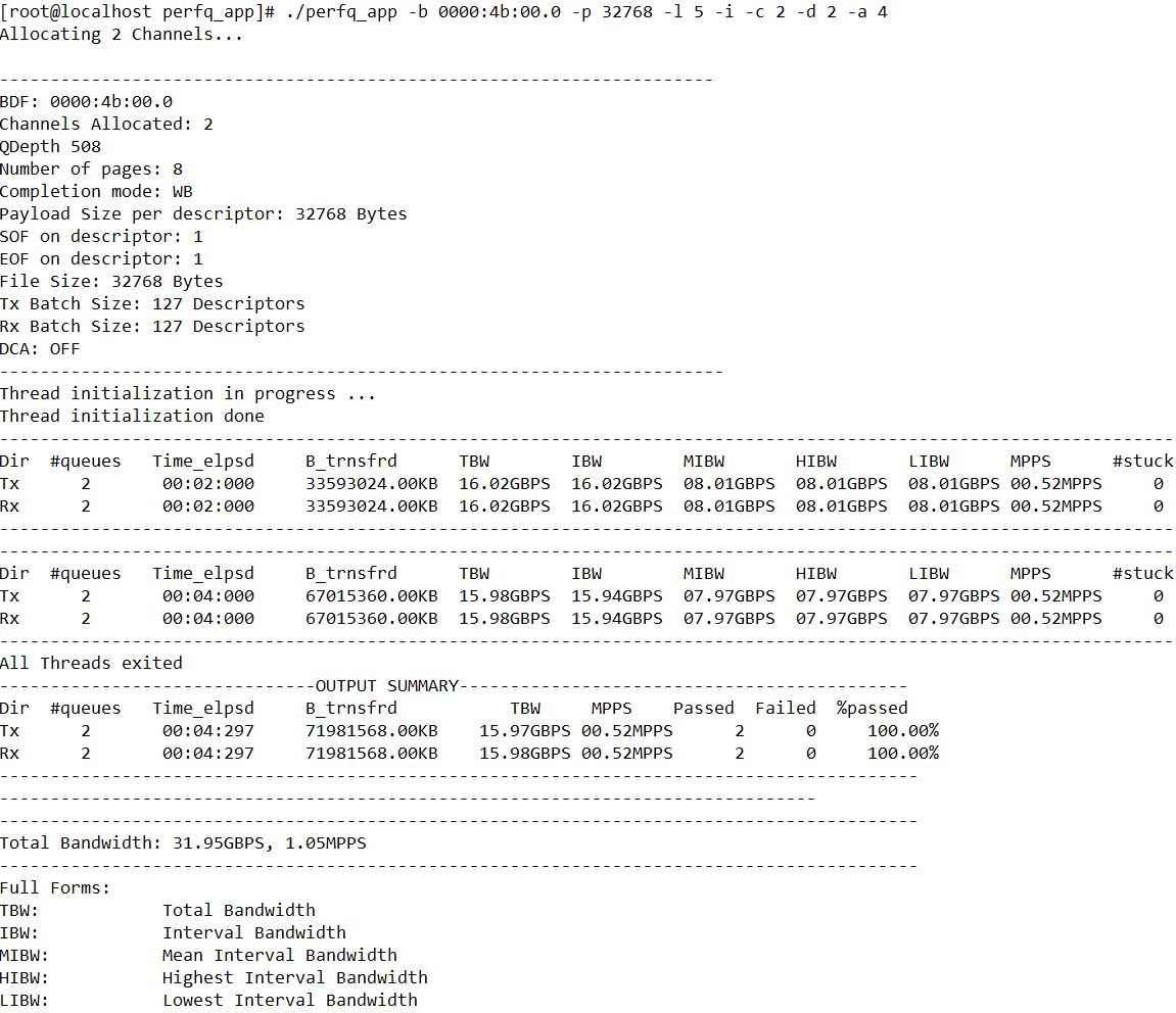 Command:$ ./perfq_app -b 0000:01:00.0 -p 32768 -l 5 -u -c 2 -d 2 -a 4