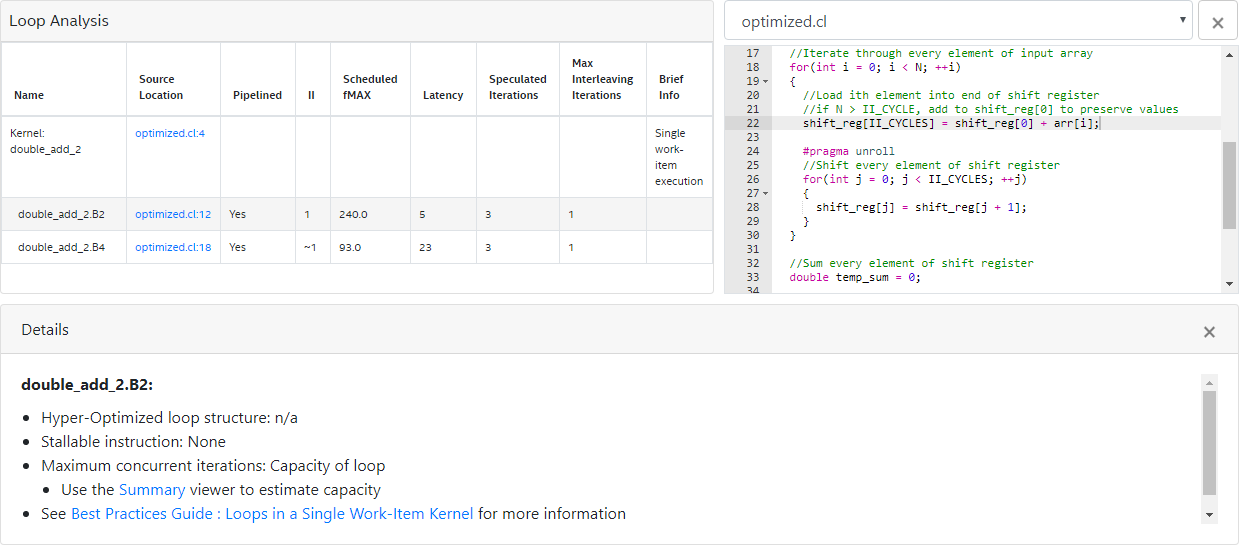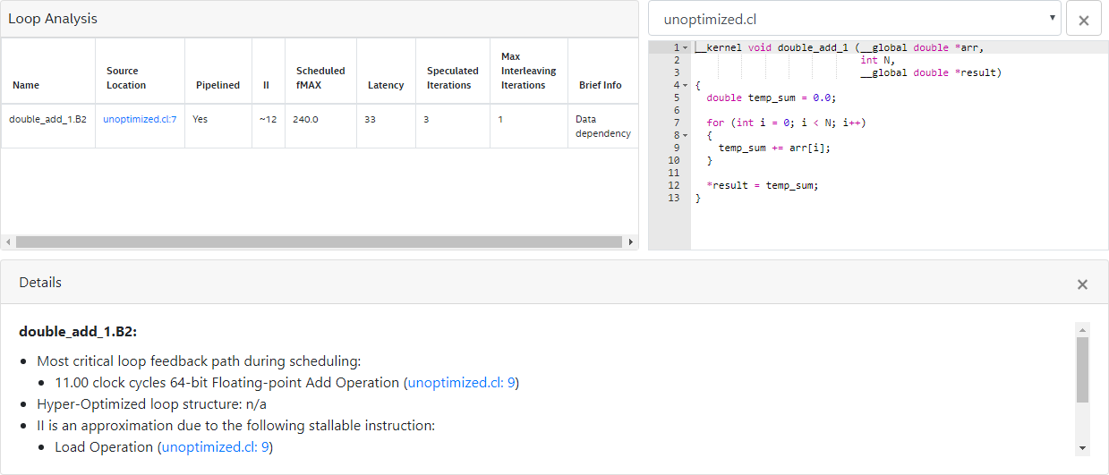The kernel unoptimized is an accumulator that sums the elements of a double precision floating-point array arr[i]. For each loop iteration, the offline compiler takes 11 cycles to compute the result of the addition and then stores it in the variable temp_sum. Each loop iteration requires the value of temp_sum from the previous loop iteration, which creates a data dependency on temp_sum.