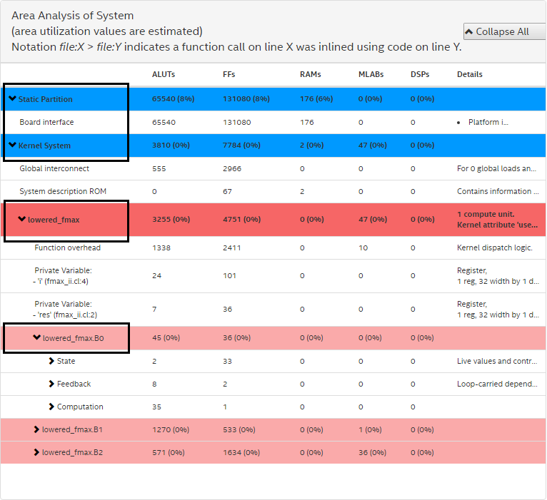 Note: The analyze-area Intel® FPGA SDK for OpenCL™ utility option has been deprecated. For reference information on the deprecated area report, refer to the Review Your Kernel's Area Report to Identify Inefficiencies in Resource Usage section in version 16.0 of the Altera SDK for OpenCL Best Practices Guide.