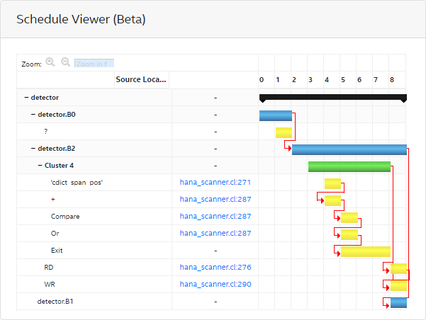 The Schedule Viewer displays a static view of the scheduled cycle and latency of a clustered group of instructions in your design. Use this report to view loop bottlenecks such as fMAX/II bottlenecks, memory dependency, and occupancy limiter.