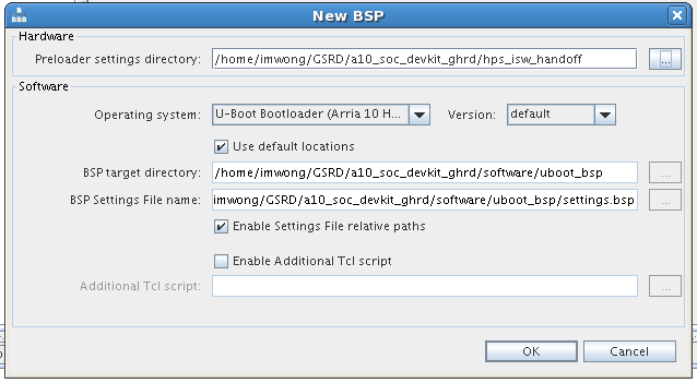 - Leave the Use default locations enabled to create the new BSP in the <your_working_directory>/a10_soc_devkit_ghrd/software/uboot_bsp folder.