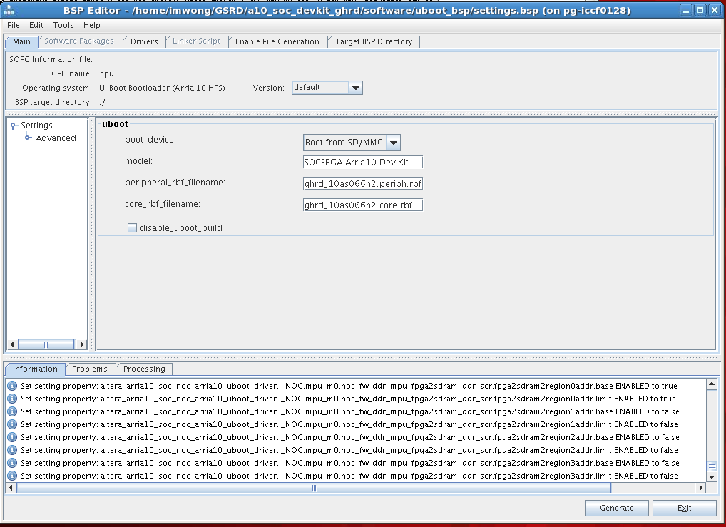 The following files are generated in the <your_working_directory>//a10_soc_devkit_ghrd/software/uboot_bsp folder: