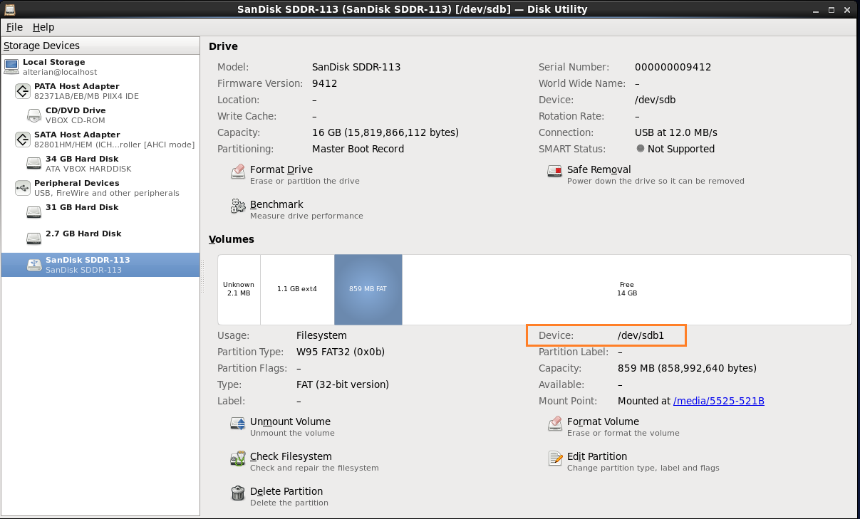 - Observe that the FAT partition location at /dev/sdb1.