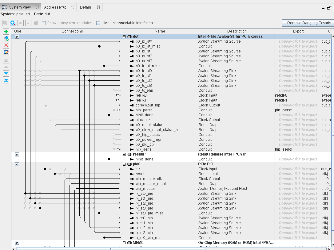 - The generated R-tile Avalon® Streaming (Avalon-ST) Hard IP Endpoint variant (DUT) with the parameters you specified. This component drives TLP data received to the PIO application. It translates the PCIe serial data received from the link to the Avalon® -ST data format.