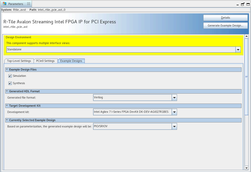 Note: If you select None, the generated design example targets the device you specified in Step 5 above. If you intend to test the design in hardware, make the appropriate pin assignments in the .qsf file. You can also use the pin planner tool to make pin assignments.Note: If you select a development kit, the device on that board overwrites the device selected in the Intel® Quartus® Prime project if the devices are different.Note: For Currently Selected Example Design, select PIO/SRIOV or PERFORMANCE_DESIGN.