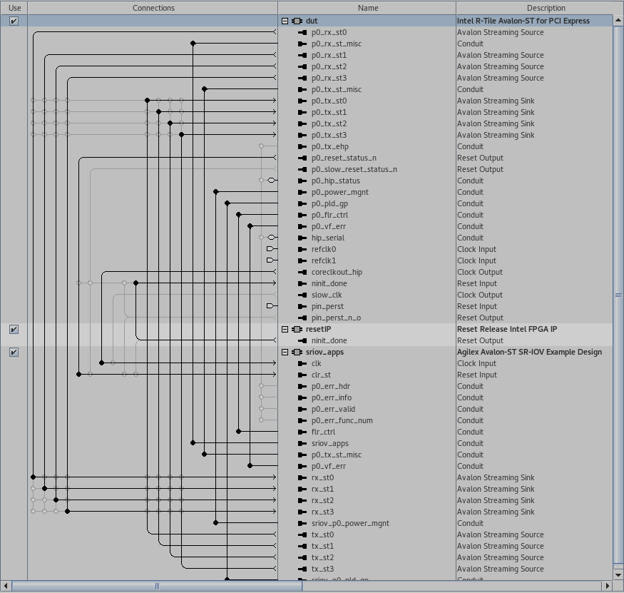 • The generated R-Tile Avalon Streaming (Avalon-ST) IP Endpoint variant (DUT) with the parameters you specified. This component drives the received TLP data to the SR-IOV application.