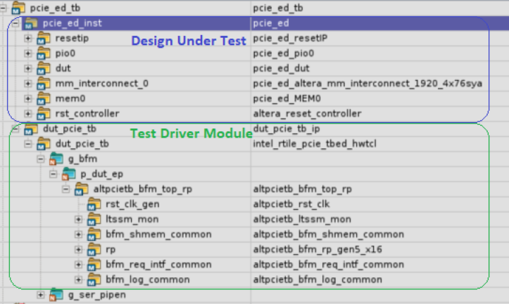 The figure below shows the PIO design example simulation design hierarchy. The tests for the PIO design example are defined with the apps_type_hwtcl parameter set to 3. The tests run under this parameter value are defined in ebfm_cfg_rp_ep_rootport, find_mem_bar and downstream_loop.
