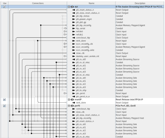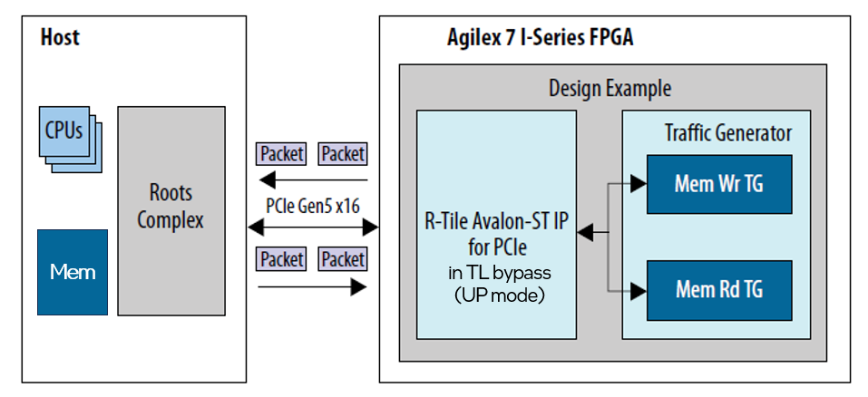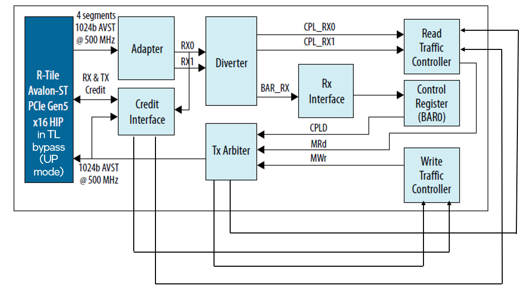 - The generated R-Tile Avalon Streaming Hard IP Endpoint variant (DUT) in TL Bypass. This component interacts with the root complex at the other end of the PCIe link and translates the data on the PCIe link into the Avalon Streaming (AvalonST) data format.