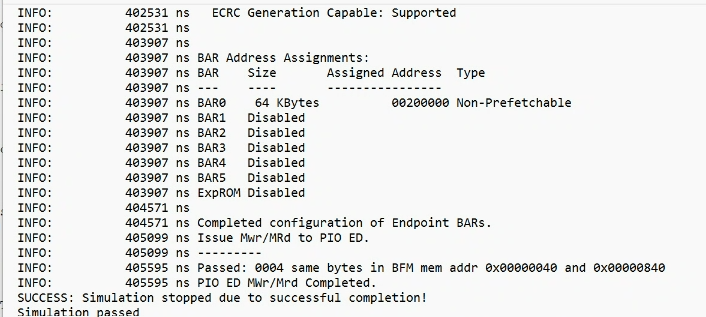 - Execute the following command: sh xcelium_setup.sh USER_DEFINED_VERILOG_COMPILE_OPTIONS="-sv\ +define+rnrb_one_lib_RNR_OVERCLK_FASTSIM\ +define+RNR_FASTSIM_AIB_BYPASS\ +define+rnrb_one_lib_RNR_PCIE_TOP_EQ_BYPASS_FASTSIM\ +define+rnrb_one_lib_RNR_PCIE_TOP_EQ_BYPASS_FASTSIM_H2H\ +define+rnrb_one_lib_RNR_FASTSIM_FORCE_PLL_LOCK_TIME\ +define+XTOR_PCIECXL_LM_SVS_SERDES_ARCHITECTURE\ +define+rnrc_one_lib_RNR_OVERCLK_FASTSIM\ +define+rnrc_one_lib_RNR_PCIE_TOP_EQ_BYPASS_FASTSIM\ +define+rnrc_one_lib_RNR_PCIE_TOP_EQ_BYPASS_FASTSIM_H2H\ +define+rnrc_one_lib_RNR_FASTSIM_FORCE_PLL_LOCK_TIME\ +define+XTOR_PCIECXL_LM_SVS_SERDES_ARCHITECTURE" USER_DEFINED_ELAB_OPTIONS="-timescale\ 1ns/1ps" DEFAUL_ELAB_OPTIONS="-access\ +r+w" USER_DEFINED_SIM_OPTIONS="-input\ @run" TOP_LEVEL_NAME="pcie_ed_sim_tb.pcie_ed_sim_tb" | tee simulation.log