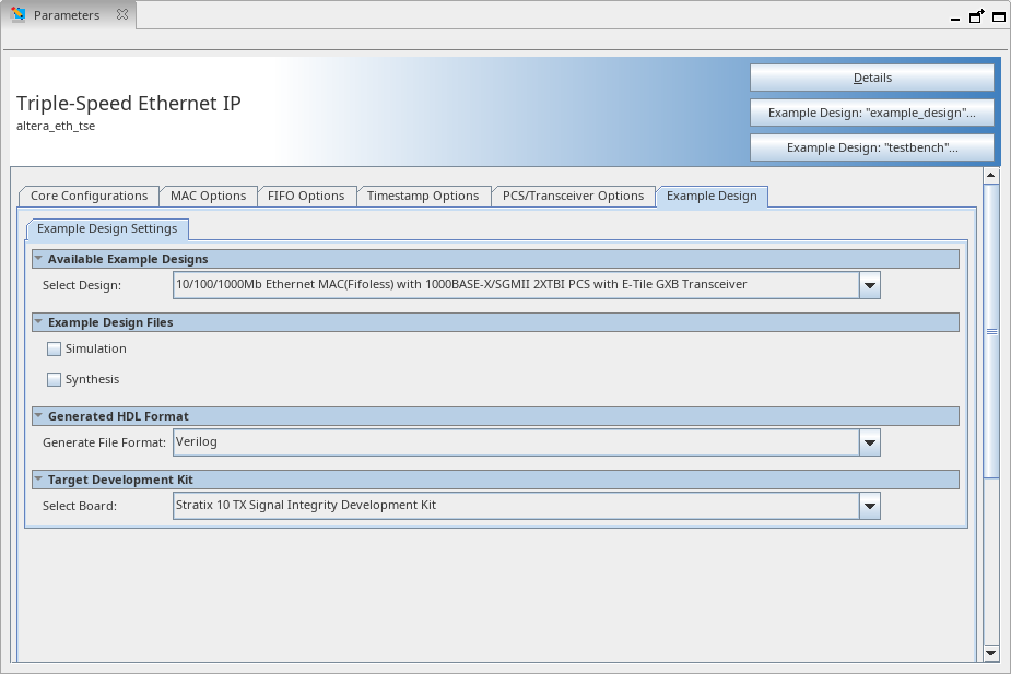 Figure 4. Example Design Tab in the Triple-Speed Ethernet IP Parameter Editor