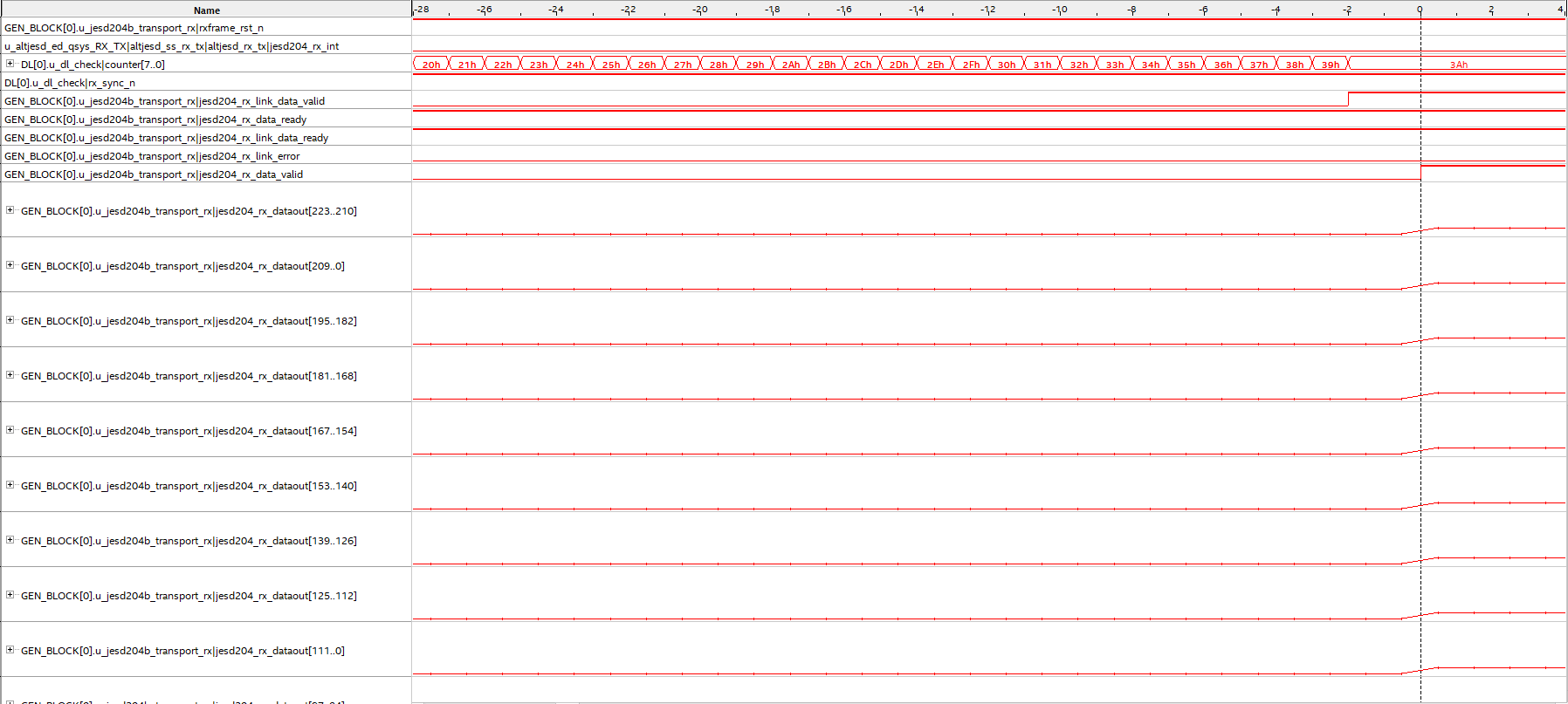 The following figure shows the Signal Tap waveform of the link latency count from the deassertion of SYNC~ to the assertion of the jesd204_rx_link_valid signal. The link latency count (in link clock cycles) measures the first user data output latency.