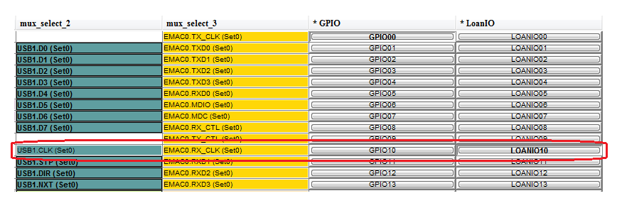 On the Peripheral Pins tab, scroll down to the Peripherals Mux Table to select the USB clock pin as loan I/O. This setting allows a clock from a PLL in the FPGA to connect to the USB controller.