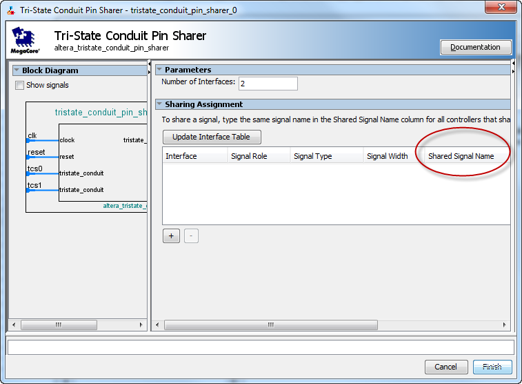 The parameter editor includes a Shared Signal Name column. If the widths of shared signals differ, the signals are aligned on their 0th bit and the higher-order pins are driven to 0 whenever the smaller signal has control of the bus. Unshared signals always propagate through the pin sharer. The tri-state conduit pin sharer uses the round-robin arbiter to select between tri-state conduit controllers.