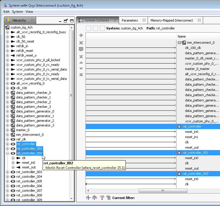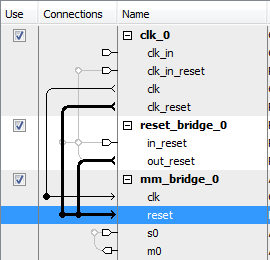 When you generate your component, Platform Designer inserts adapters to synchronize or invert resets if there are mismatches in polarity or synchronization between the source and destination. You can view inserted adapters on the Memory-Mapped Interconnect tab with the System > Show System with Platform Designer Interconnect command.