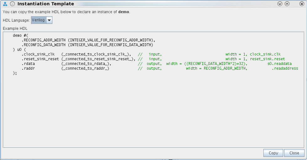 To instantiate the IP component in your HDL file, click Generate > Show Instantiation Template in the Platform Designer editor to display an instantiation template in Verilog or VHDL. Now you can instantiate the IP core in your top-level design HDL file with the template code.
