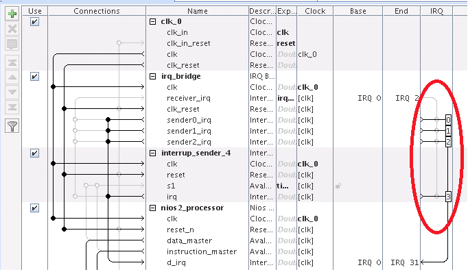 Figure 229. IRQ Column in Platform Designer Circled in the IRQ column are the default interrupt priorities allocated for the CPU subsystem.